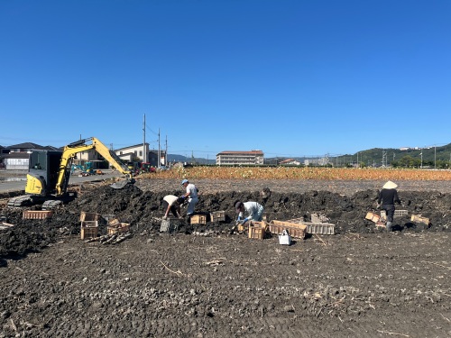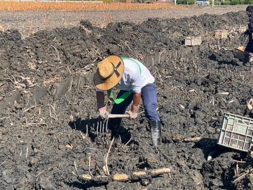 「連島れんこん」は、専用のくわを使って、1本1本ていねいに収穫していきます。
