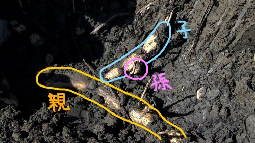 親レンコン、子レンコン、孫レンコンとつながっています。