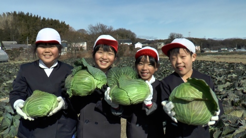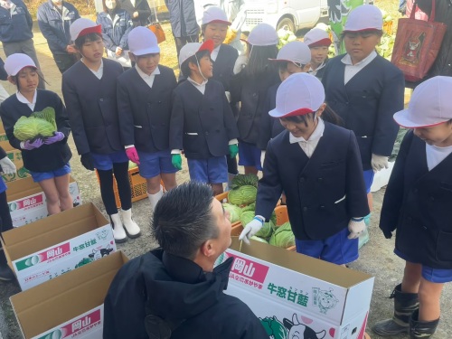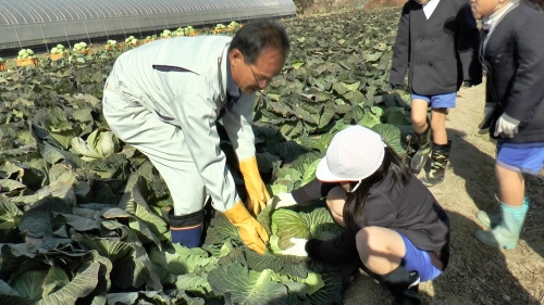 生産者に教わりながら、子どもたちが大きなキャベツをとっていきます。