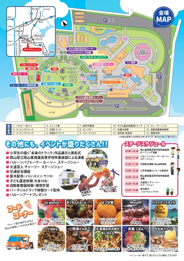 大型ダンプカーの展示やフォークリフトの操作体験のほか、季節のフルーツ販売など、家族で楽しめる催しものが盛りだくさん。