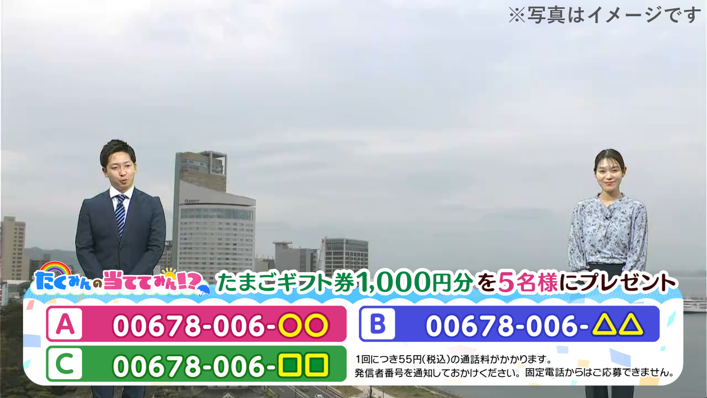 『金曜ライブ いまドキッ!』内の『たくみんの当ててみん!?』でクイズを出題!答えだと思う番号に電話をかけて「たまごギフト券1,000円分」をGETしよう!