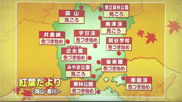 岡山県北部ではすでに見頃を迎えている名所もありますが、県南部や香川県ではこれからピークを迎えるところも多く、まだまだ紅葉狩りの計画を立てるチャンスは十分にあります。