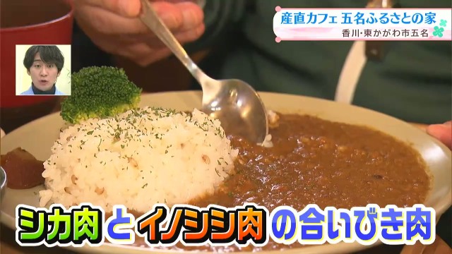 看板メニューの「カレー」には、鹿肉と猪肉の合い挽き肉がたっぷりと使われています。