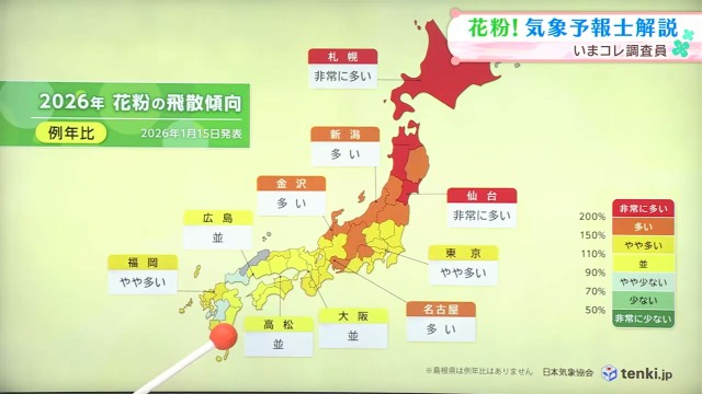気象予報士の解説によると、今シーズンの花粉飛散量は、非常に多かった前シーズンに比べれば落ち着くものの、「例年並み」の飛散が予測されています🌲