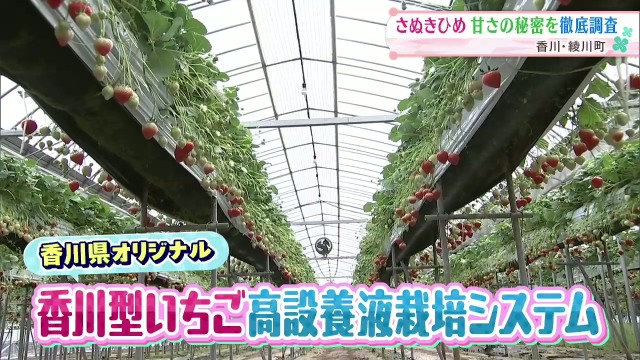 香川県が独自に開発した「高設栽培」という手法が取られており、イチゴを地面より高い位置で育てています。