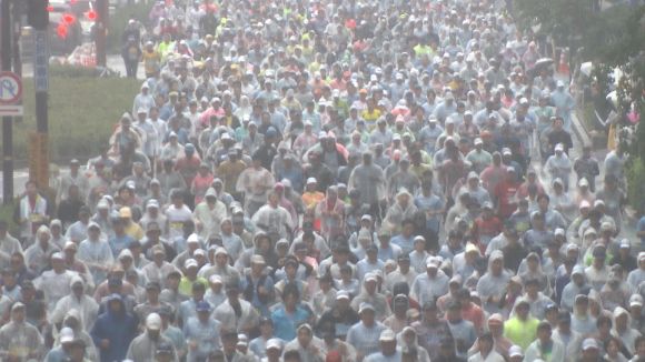 雨の中、1万6400人が参加し、秋の岡山路を駆け抜けた。